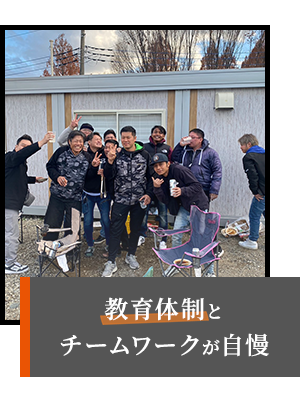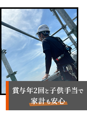 スタッフは約20名、20〜40代まで幅広い世代の鳶職人が在籍中! 合言葉は「思いやり」。 自分のことだけでなく、仲間やお客様のことも考えて動くのが当たり前の現場です! 怒鳴り声が飛び交うような雰囲気ではなく、 声をかけ合いながら安全に作業を進めるチームワーク型のスタイルが根づいています。
